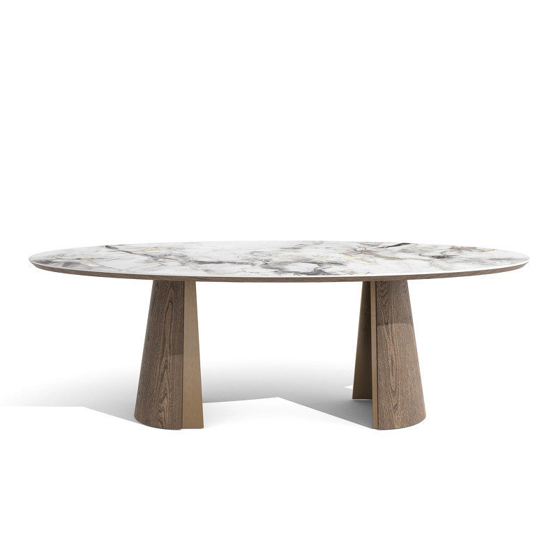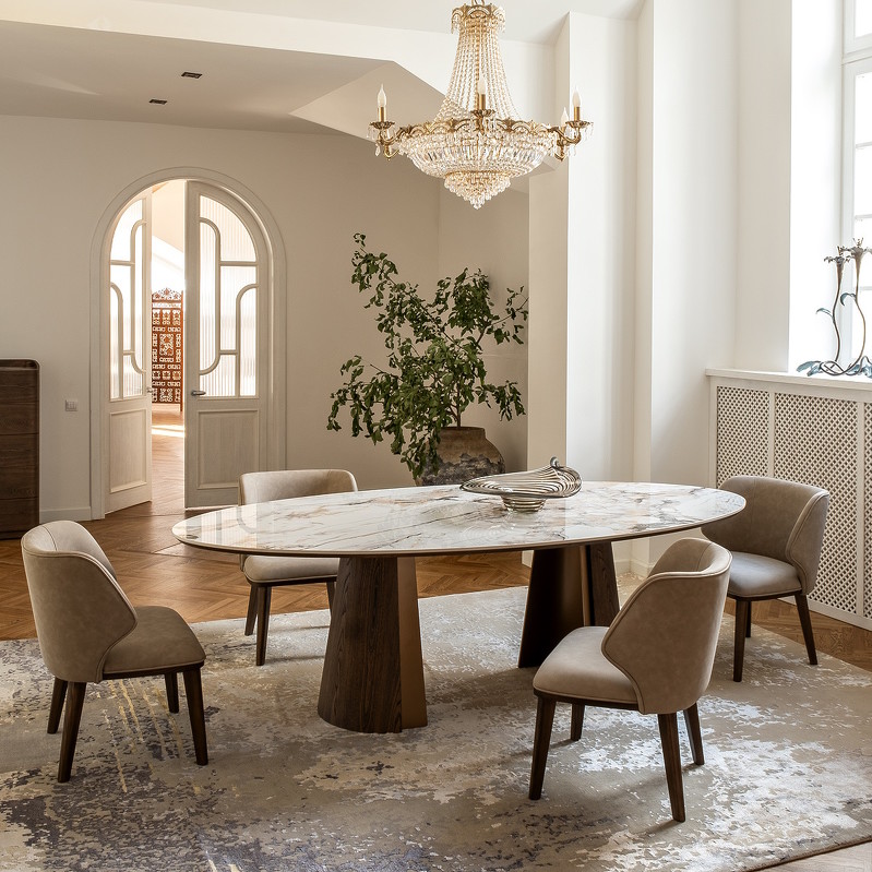 Стол с акцентной овальной керамической столешницей и интересными полукруглыми ножками станет центром современной столовой группы.