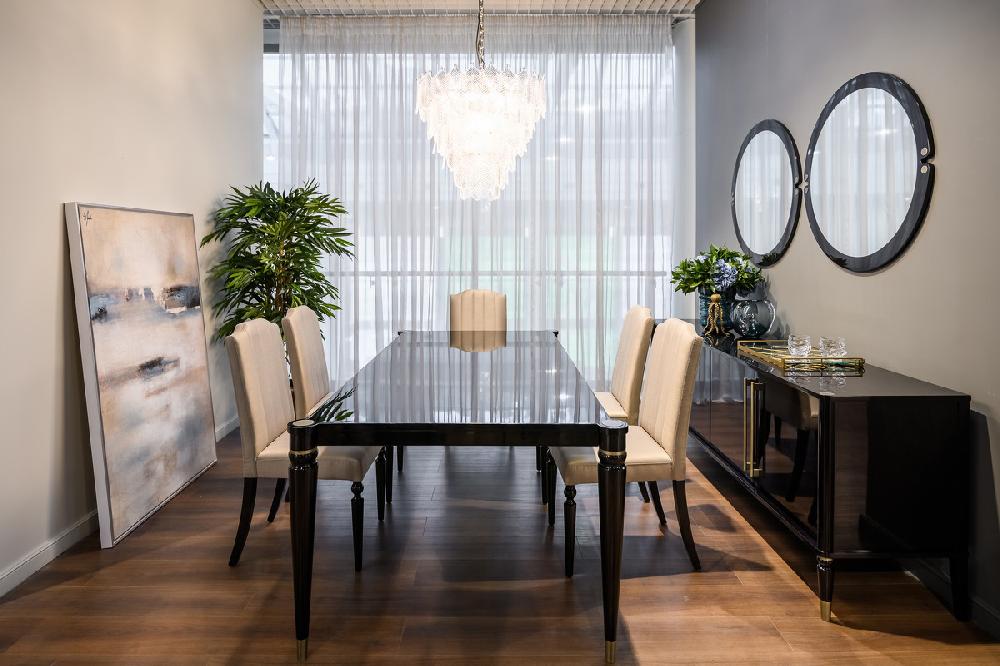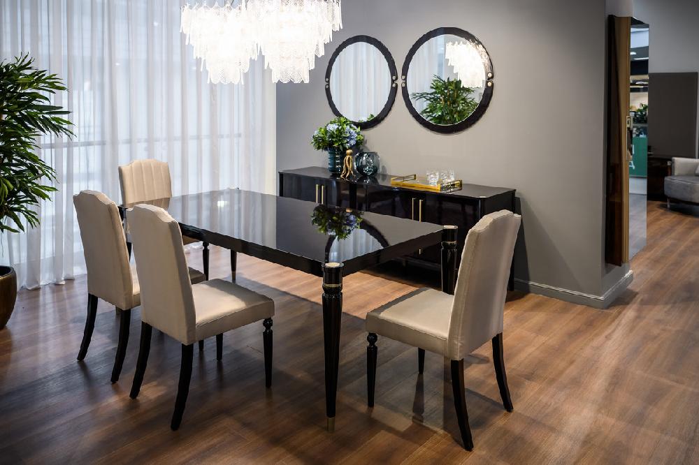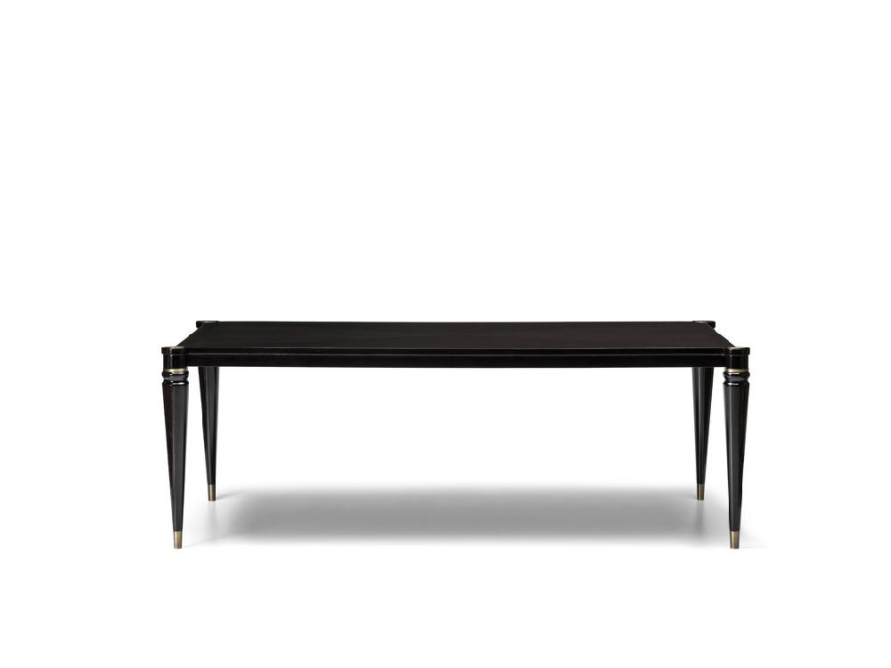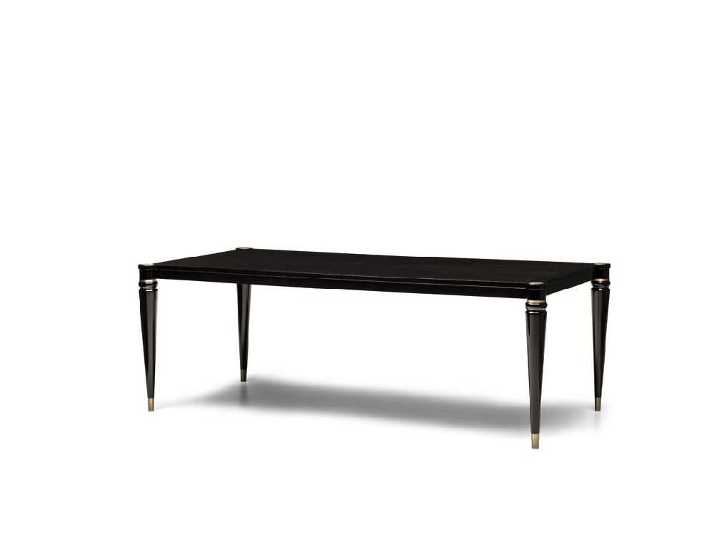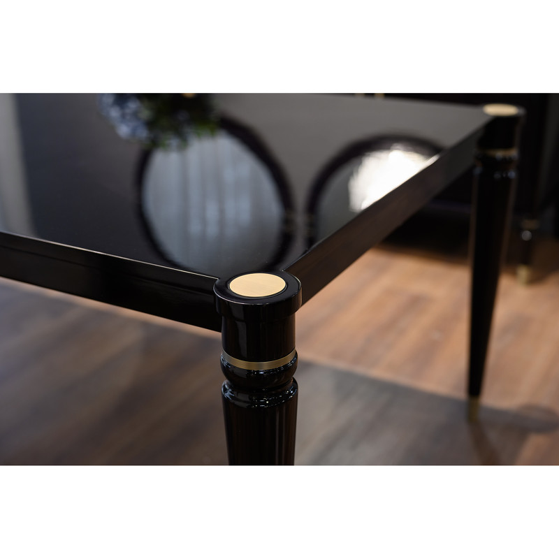Обеденный стол выполнен в стиле Ар-деко. Столешница изготовлена из высококачественного шпонированного МДФ высокой плотности. Ножки массив бука. Детали выполнены из нержавеющей стали с латунным покрытием.