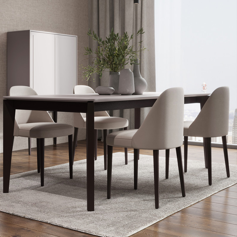 Столешница — приятный серый матовый оттенок. Ножки из шпонированного массива березы — темно-коричневая (почти черная) древесина.