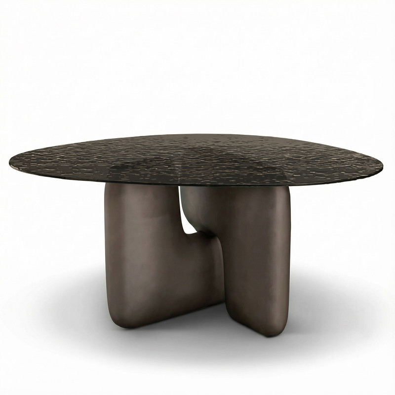 Утонченная стеклянная столешница с рисунком льда располагается на массивном основании, такое сочетание выглядит эффектно.