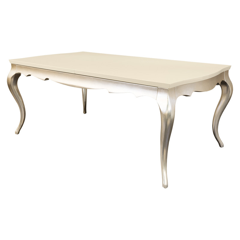 Отделка столешницы - перламутровый лак кремового цвета. Высокие гнутые ножки в отделке серебряное напыление, покрытое лаком.