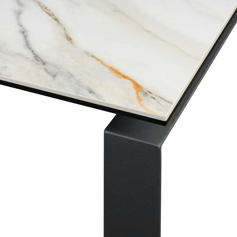 Столешница состоит из закаленного стекла (8 мм) нижним слоем и керамики (6 мм) светло-бежевого с прожилками цвета верхним слоем. Подстолье и 4 ноги - прочный металл с максимально стойким к внешним воздействиям порошковым покрытием темно-серого цвета.