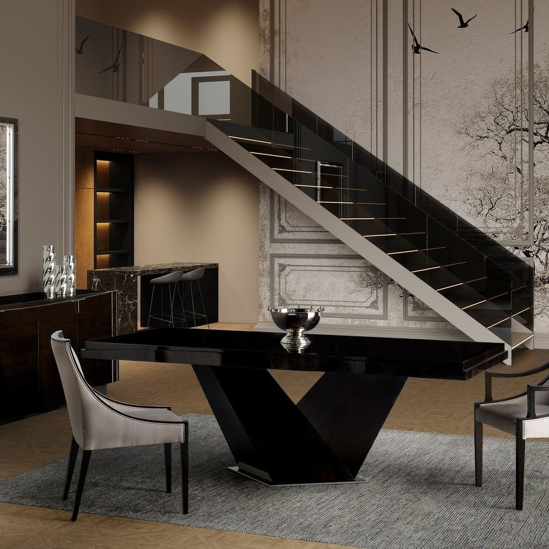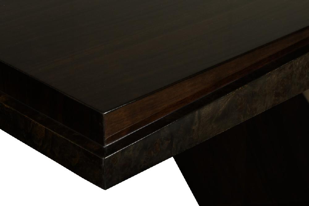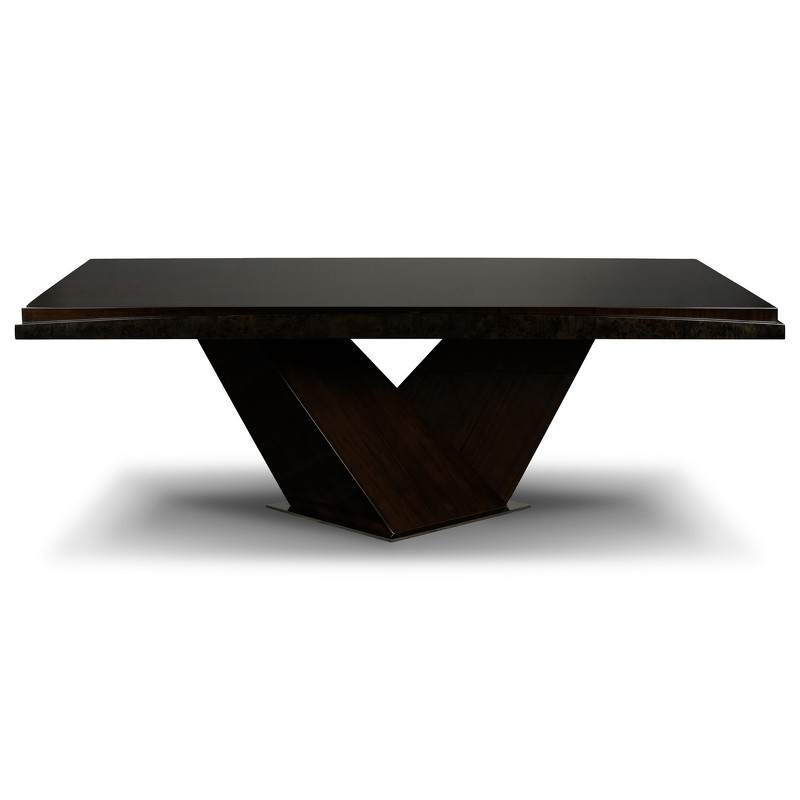Обеденный стол выполнен в стиле ар-деко. Столешница изготовлена из высококачественного шпонированного МДФ высокой плотности. Детали выполнены из полированной стали.