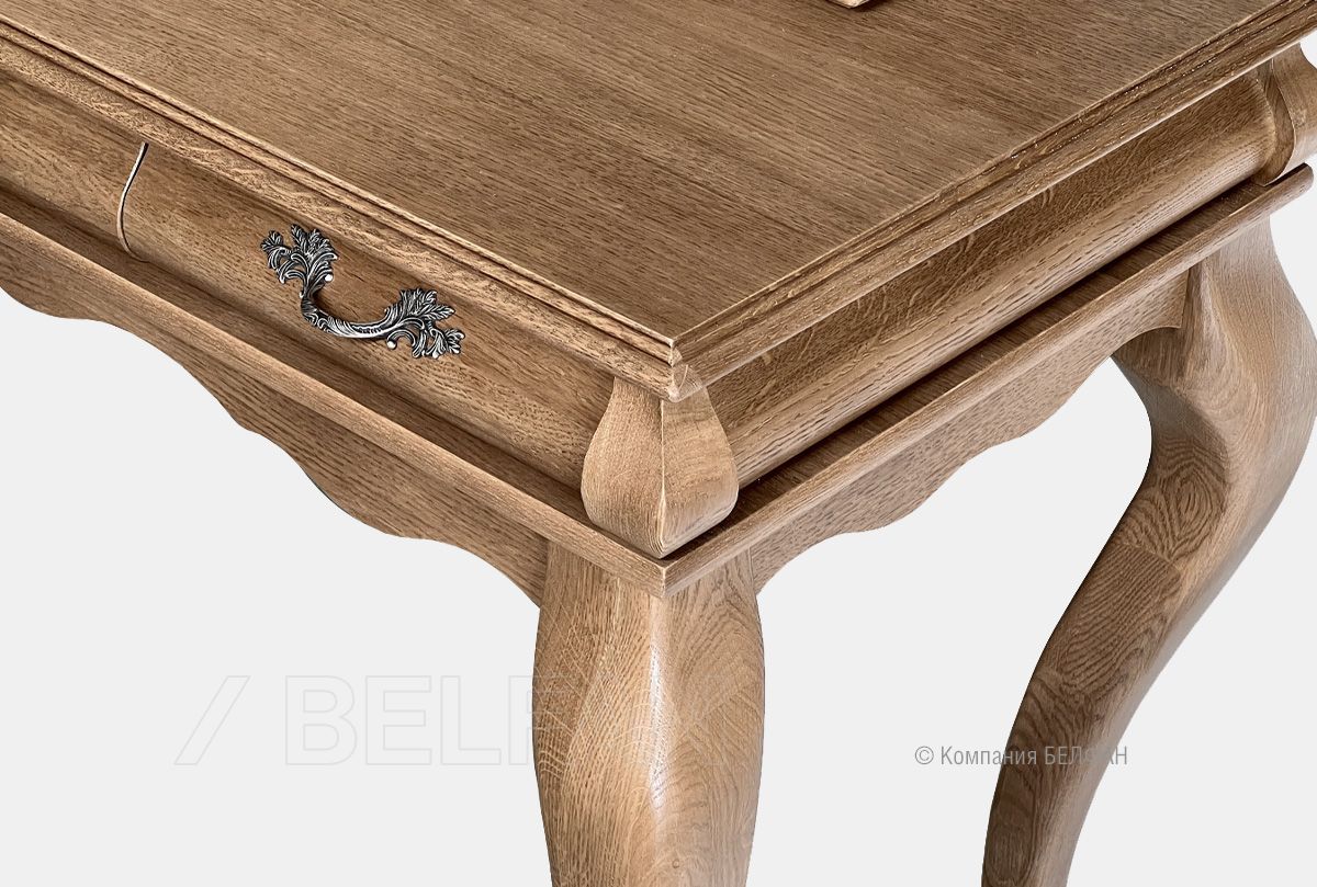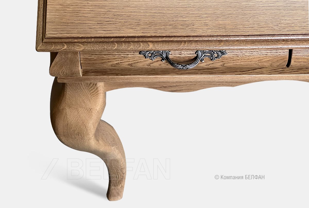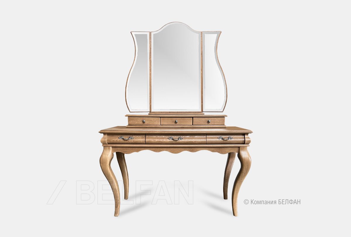 В пространство фешенебельного будуара идеально впишется элегантный туалетный стол с зеркалом, из классической коллекции «Тэфи» (tefi). В ящиках, отделанных нежным велюром, найдется место для косметики, бижутерии и ценностей, а ручки изделия украшены затейливым растительным узором. Изготовлен туалетный стол из массива дуба, который оригинально смотрится в разных цветовых решениях – «белая эмаль с темной патиной», «классик» или «амбэр с белой патиной.
