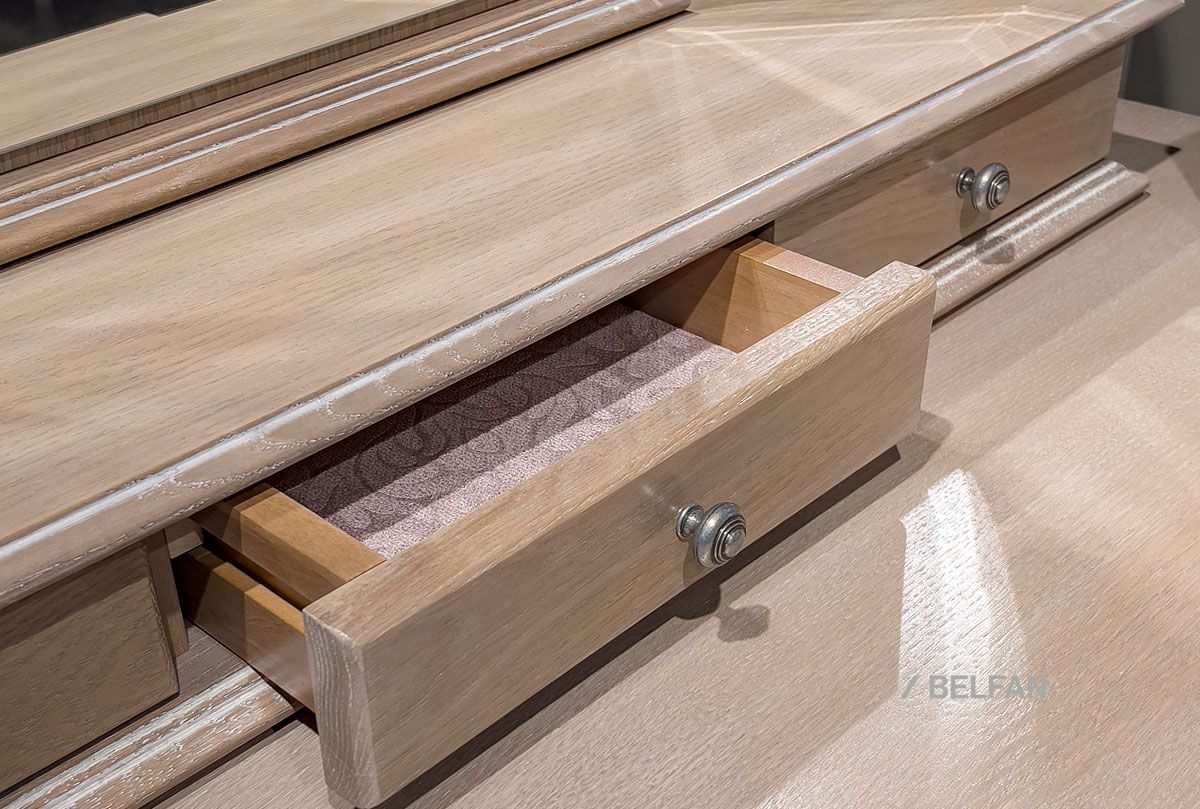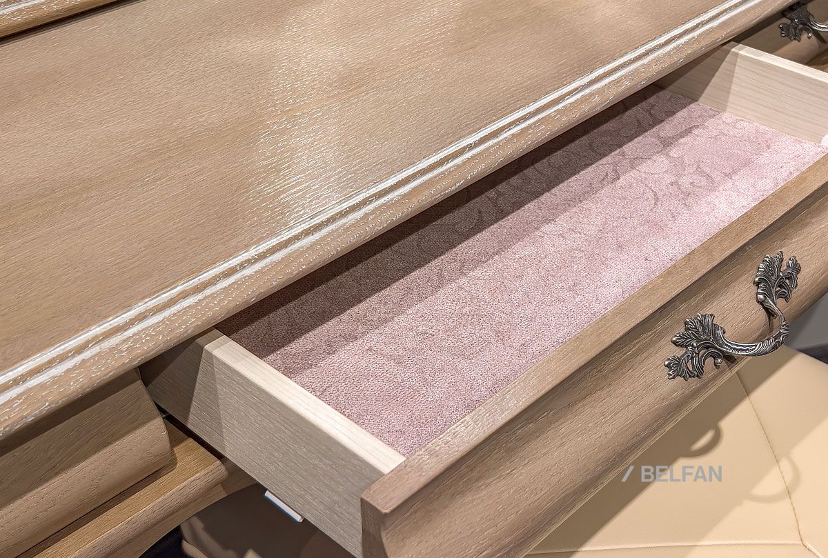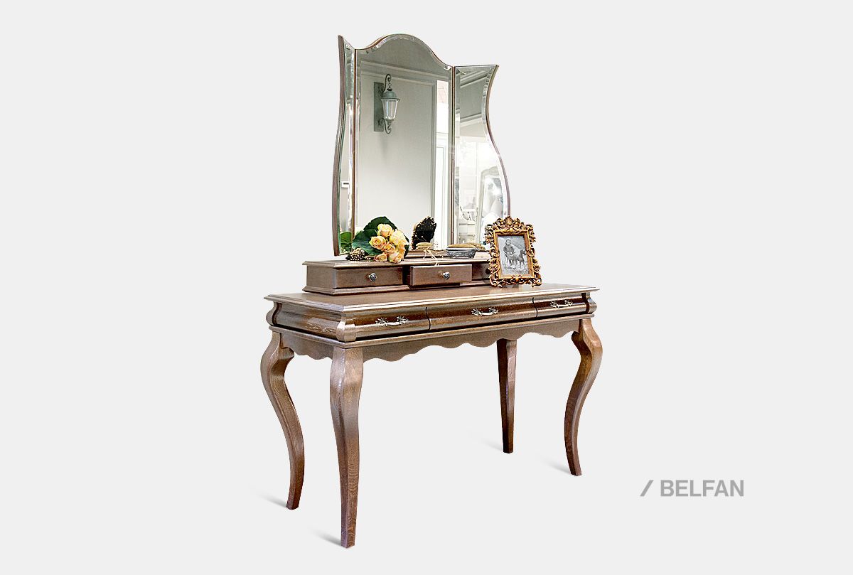 В пространство фешенебельного будуара идеально впишется элегантный туалетный стол с зеркалом, из классической коллекции «Тэфи» (tefi). В ящиках, отделанных нежным велюром, найдется место для косметики, бижутерии и ценностей, а ручки изделия украшены затейливым растительным узором. Изготовлен туалетный стол из массива дуба, который оригинально смотрится в разных цветовых решениях – «белая эмаль с темной патиной», «классик» или «амбэр с белой патиной.