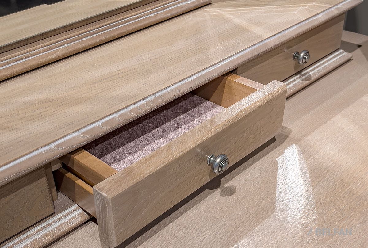 В пространство фешенебельного будуара идеально впишется элегантный туалетный стол с зеркалом, из классической коллекции «Тэфи» (Tefi). В ящиках, отделанных нежным велюром, найдется место для косметики, бижутерии и ценностей, а ручки изделия украшены затейливым растительным узором. Изготовлен туалетный стол из массива дуба, который оригинально смотрится в разных цветовых решениях – «белая эмаль с темной патиной», «классик» или «амбэр с белой патиной.