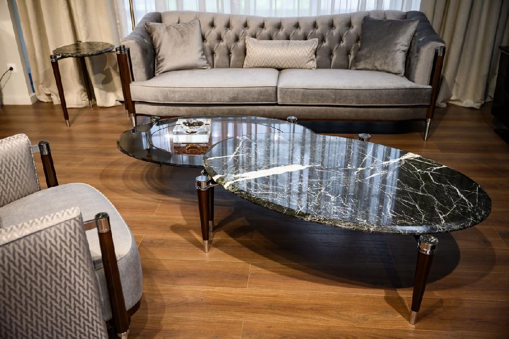 Журнальный столик выполнен в стиле Ар-деко. Столешница изготовлена из мрамора, ножки массив бука, детали металл.